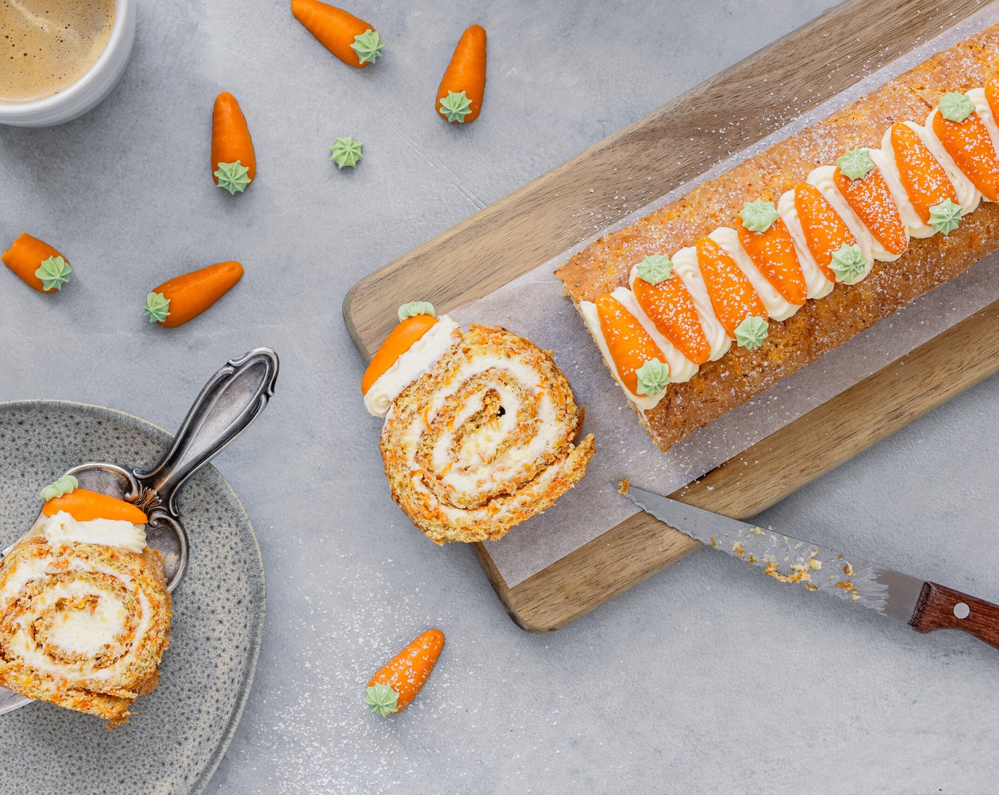 Rüeblikuchen darf an Ostern nicht fehlen. Unsere Biskuitroulade ist eine Augenweide und schmeckt mit ihrer cremigen Füllung noch viel besser.