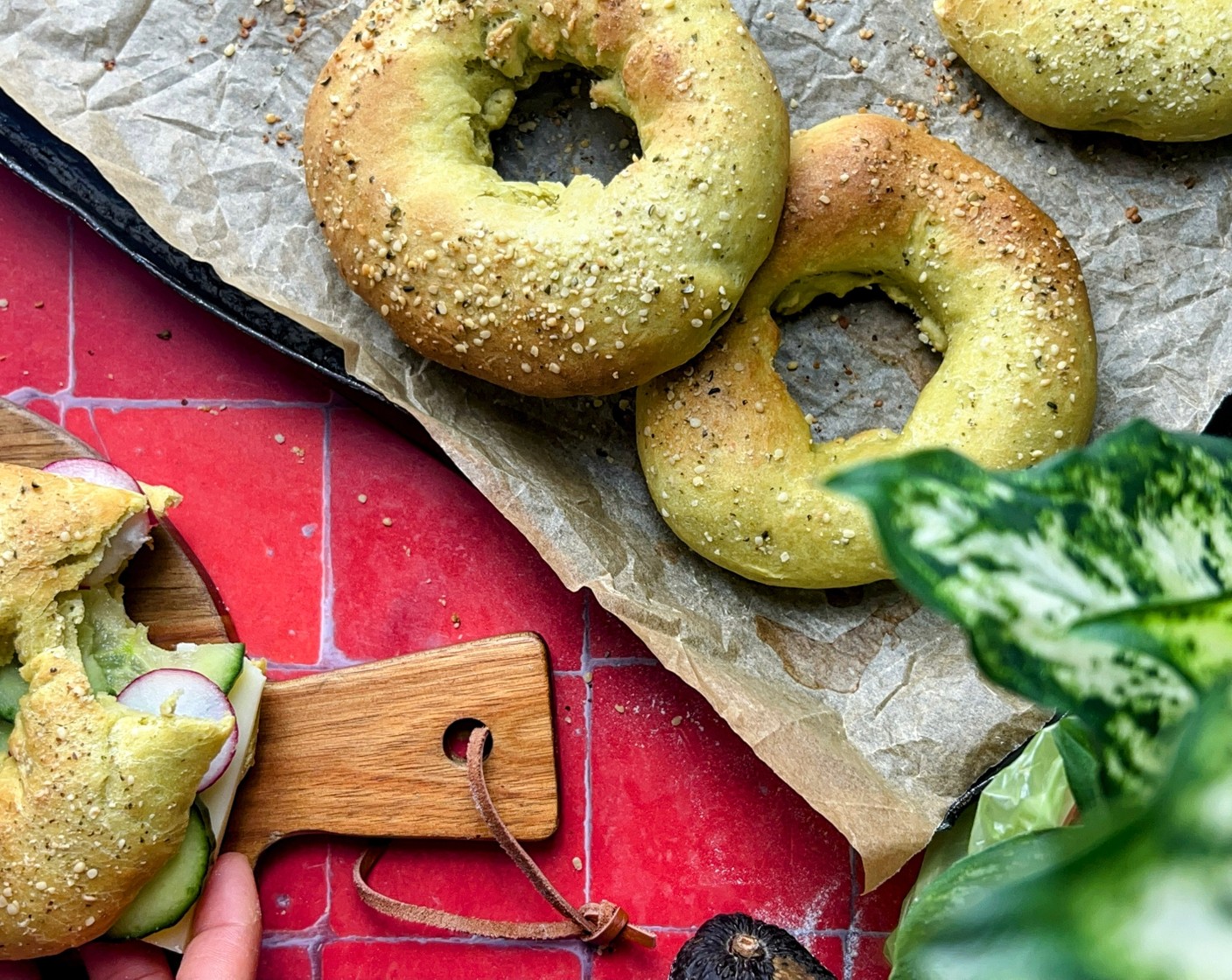 Diese fluffigen und leicht grünlichen Bagels bestehen aus nur 5 Zutaten. Mit der Avocado als Geheimzutat sind diese Bagels nicht trocken und haben extra Omega 3 Fettsäuren.