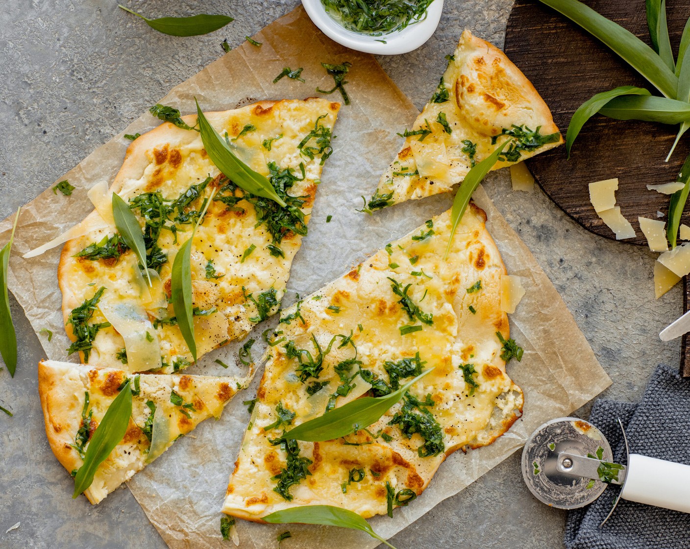 Knusprige Pizza bianca mit frischem, in Streifen geschnittenem Bärlauch und würzigem Sbrinz als Topping. Was für ein herrliches Bärlauch-Rezept!