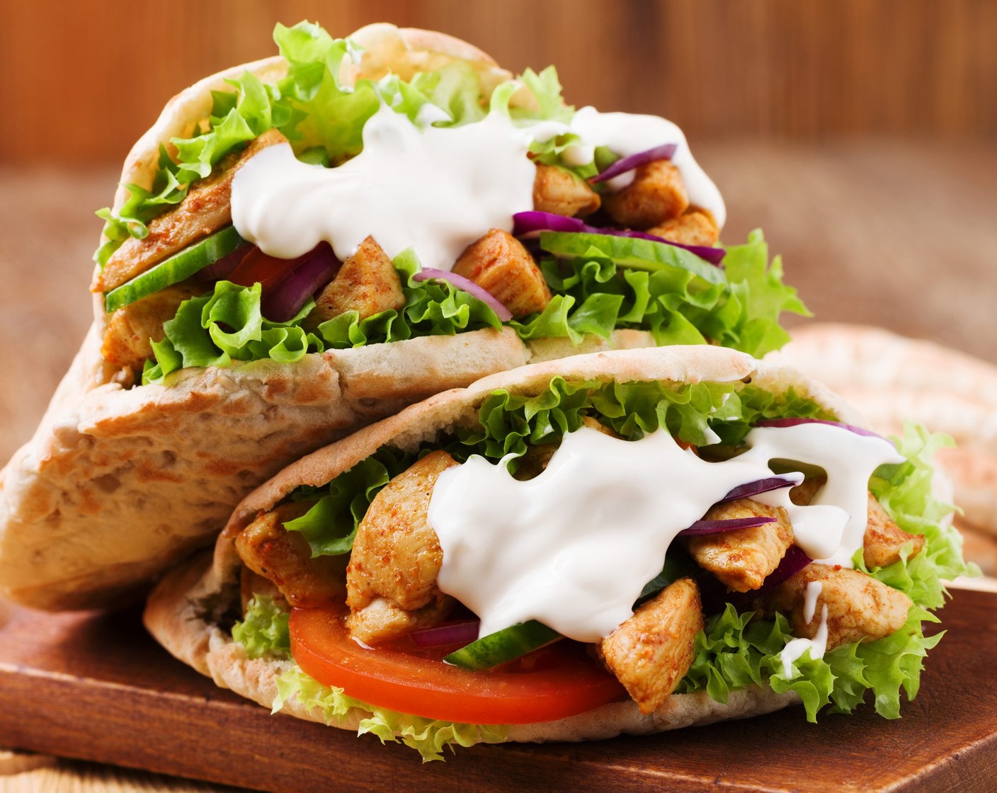 Vergiss Sandwich oder Burger, diese Pita wird mit Poulet und einer herrlichen Sauce, Eichblattsalat, Rucola, Tomate und Gurke gefüllt. Yummi-Yum!