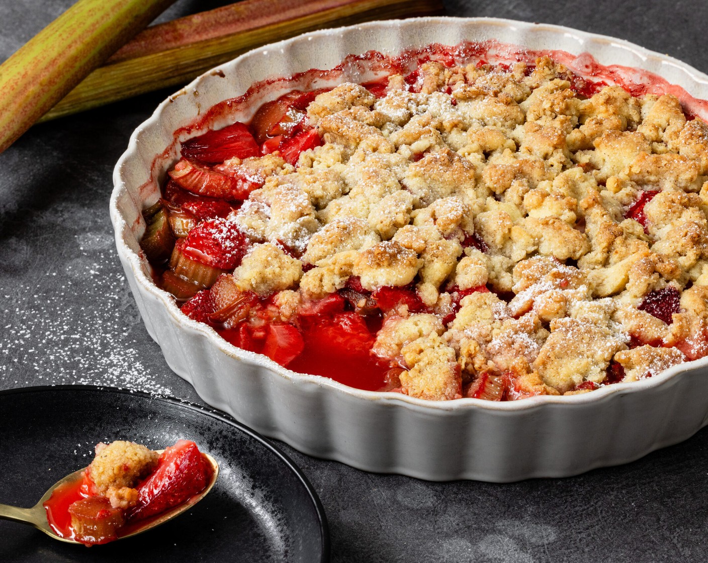 Wer kann schon einem Crumble widerstehen? Die säuerliche Note des Rhabarbers mit den Erdbeeren und dem Streusel ist eine fantastische Kombination.