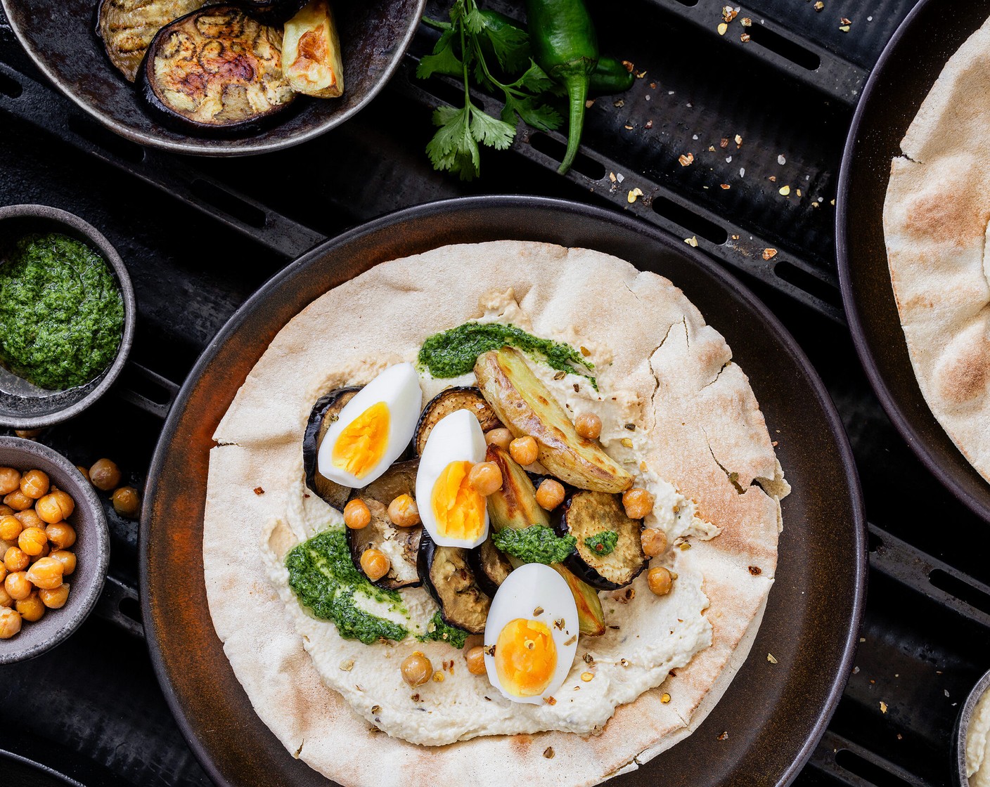 Eine orientalische Köstlichkeit: gebackene Auberginen, Kartoffeln, Kichererbsen auf Fladenbrot mit Humus und Z’houg, aromatische Kräuter-Chili-Sauce.