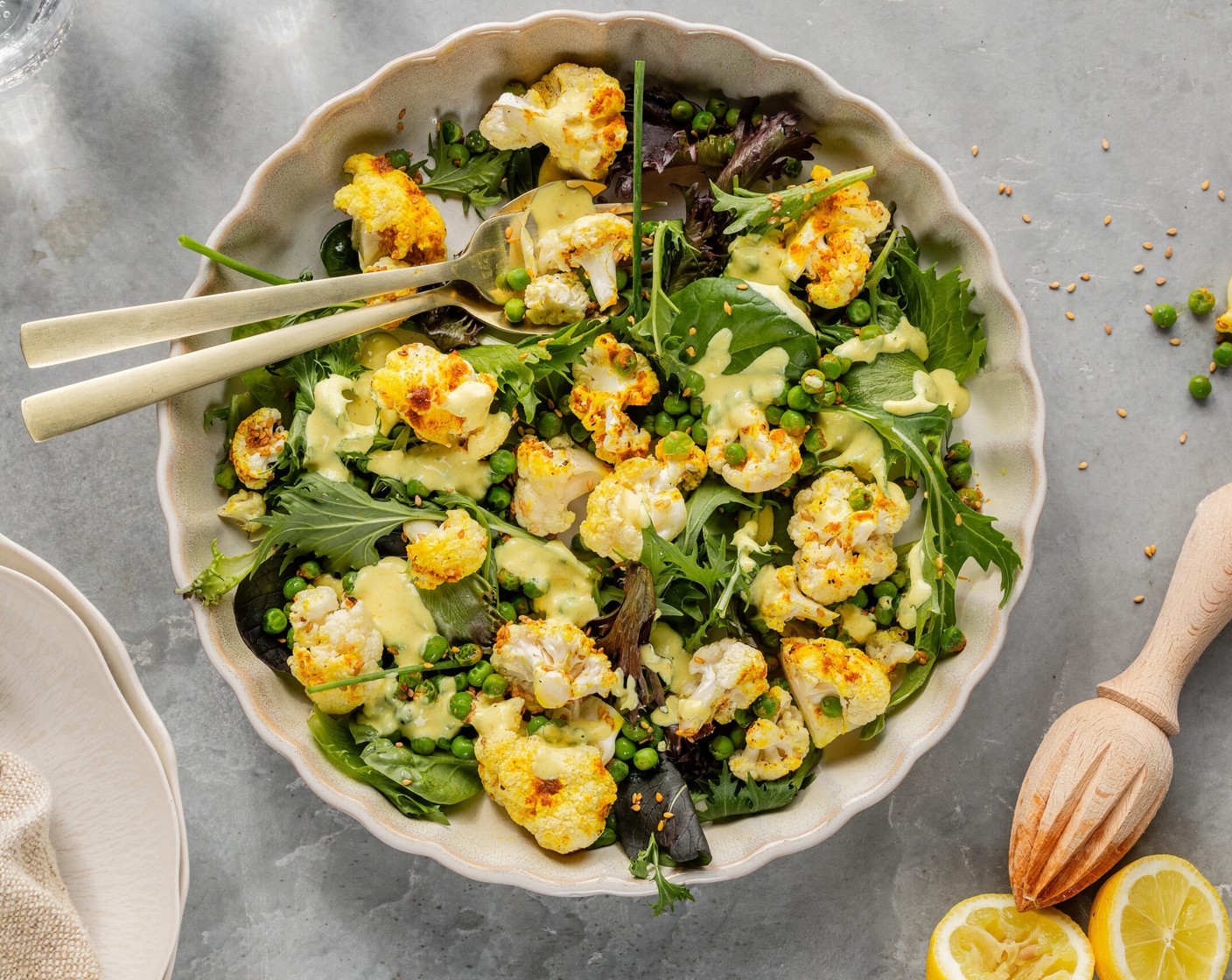 Salatfans aufgepasst: gerösteter Blumenkohl und Erbsen an aromatisch-frischer Joghurt-Curry-Sauce, angerichtet mit Jungsalat, Rucola und Nüsslisalat.