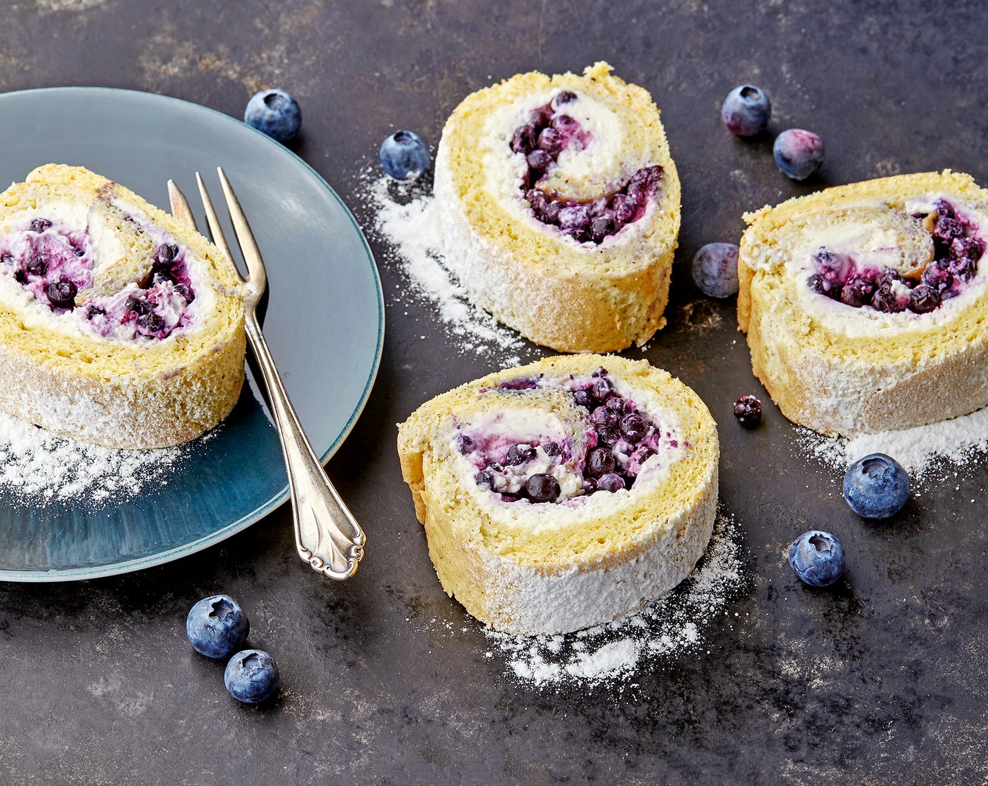 Eine herrlich luftige Roulade aus zartem Biskuit, gefüllt mit frischen Heidelbeeren und einer Mascarpone-Creme.