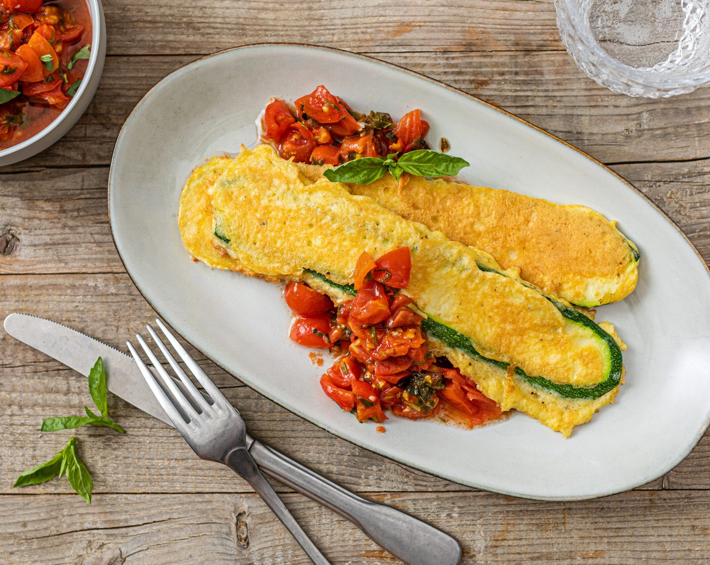 Diese Zucchetti-Piccata ist Low Carb. Zarte Zucchetti im Ei ausgebacken und dazu eine aromatische Tomatensauce mit Knoblauch und frischen Kräutern.