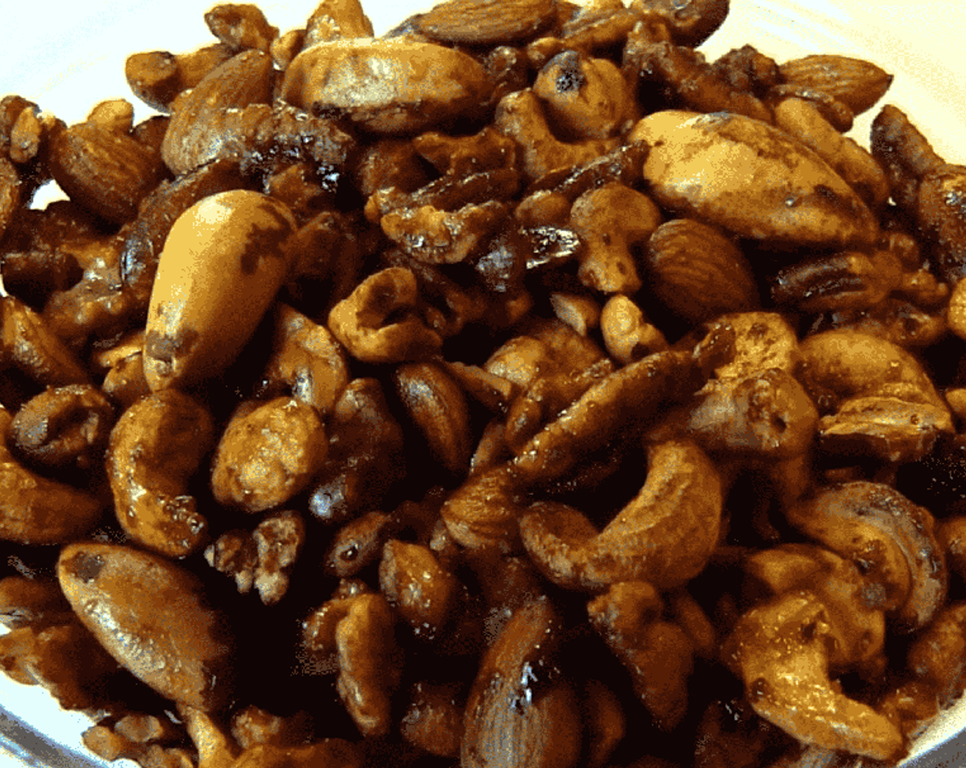 Dies ist eine Mischung aus Nüssen, die mit einer süss-pfeffrigen Sauce überzogen und im Ofen geröstet wird.