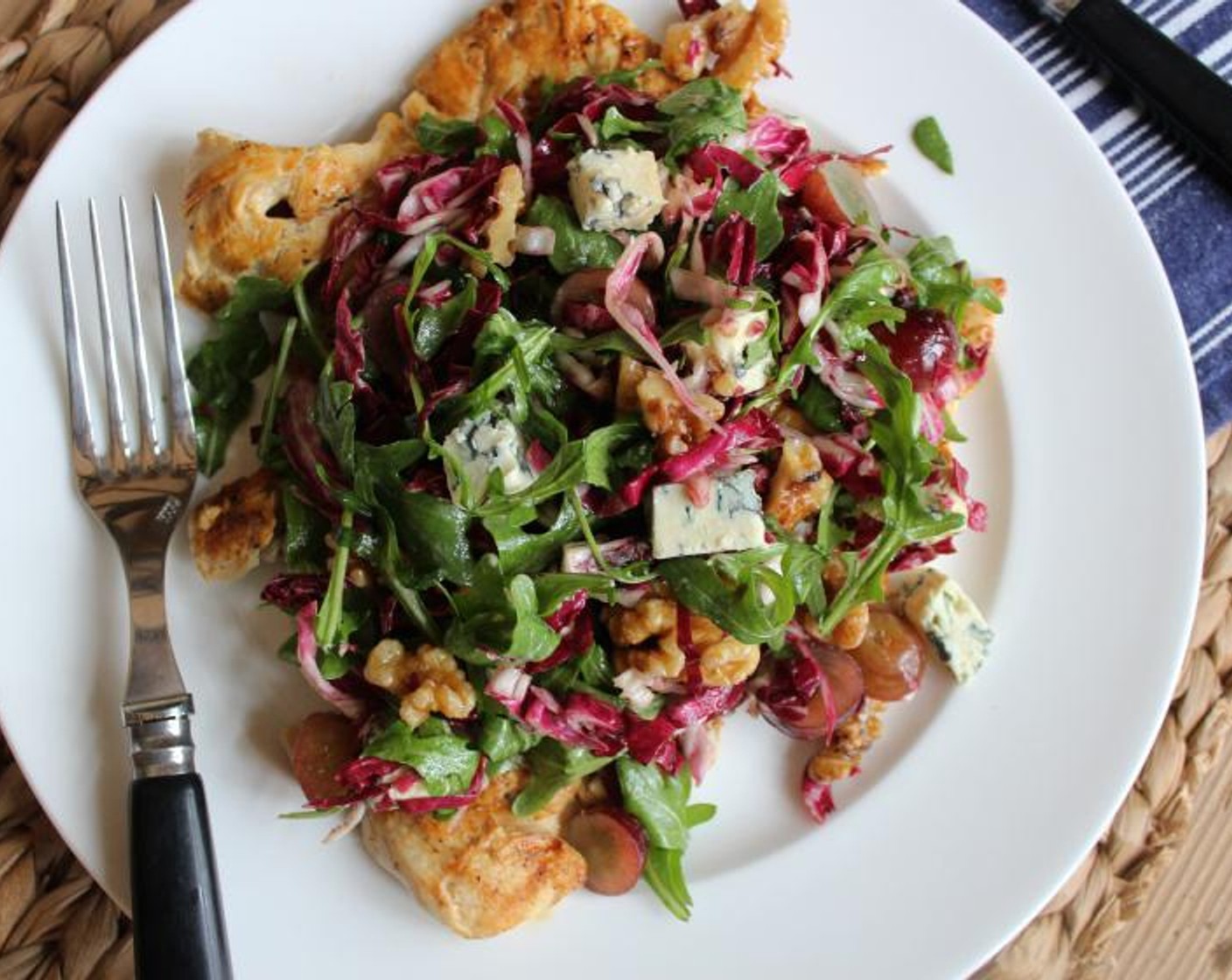 Das Auge ist regelrecht mit – Ich liebe es, wenn das gegrillte Fleisch, unter dem Berg von frischem Salat, Walnüssen, Trauben und Blauschimmelkäse hervorlugt. Die Präsentation ist wie im Restaurant, die man zu Hause ganz einfach nachmachen kann. UND, es ist die Art von Abendessen, bei der noch genug Platz für ein dekadentes Schokoladendessert bleibt.