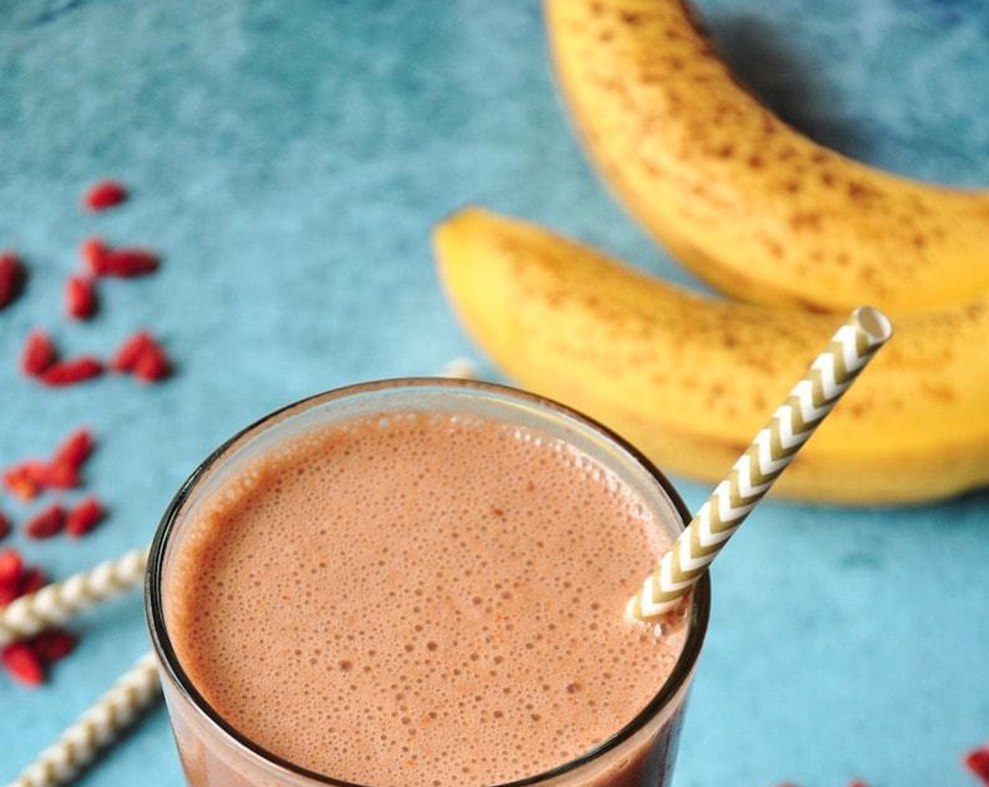 Der Schokoladen-Bananen-Smoothie mit 5 Zutaten und Goji-Beeren ist vollgepackt mit Proteinen, Vitaminen, Ballaststoffen, Kalzium und Köstlichkeiten.