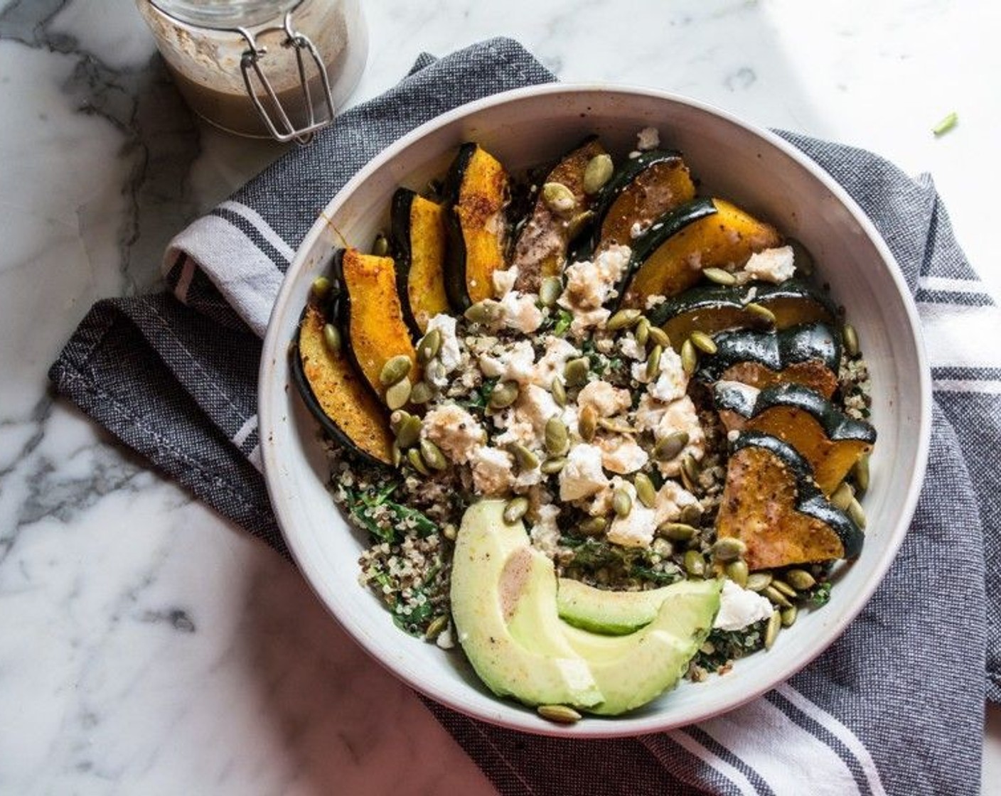 Diese Power Bowl aus geröstetem Eichelkürbis und Quinoa ist ein neuer Favorit – voller Geschmack, Nährstoffe und purer saisonaler Glückseligkeit! Serviert auf einem Bett aus Quinoa, garniert mit Ziegenkäse, Kürbiskernen und Avocado, vereint diese Bowl viele meiner Lieblingsspeisen - besonders zu dieser Jahreszeit. Und die cremige Apfelwein-Balsamico-Vinaigrette ist die perfekte Abrundung. Nicht zu süss und nicht zu sauer, sondern die perfekte Mischung aus süss und herzhaft.