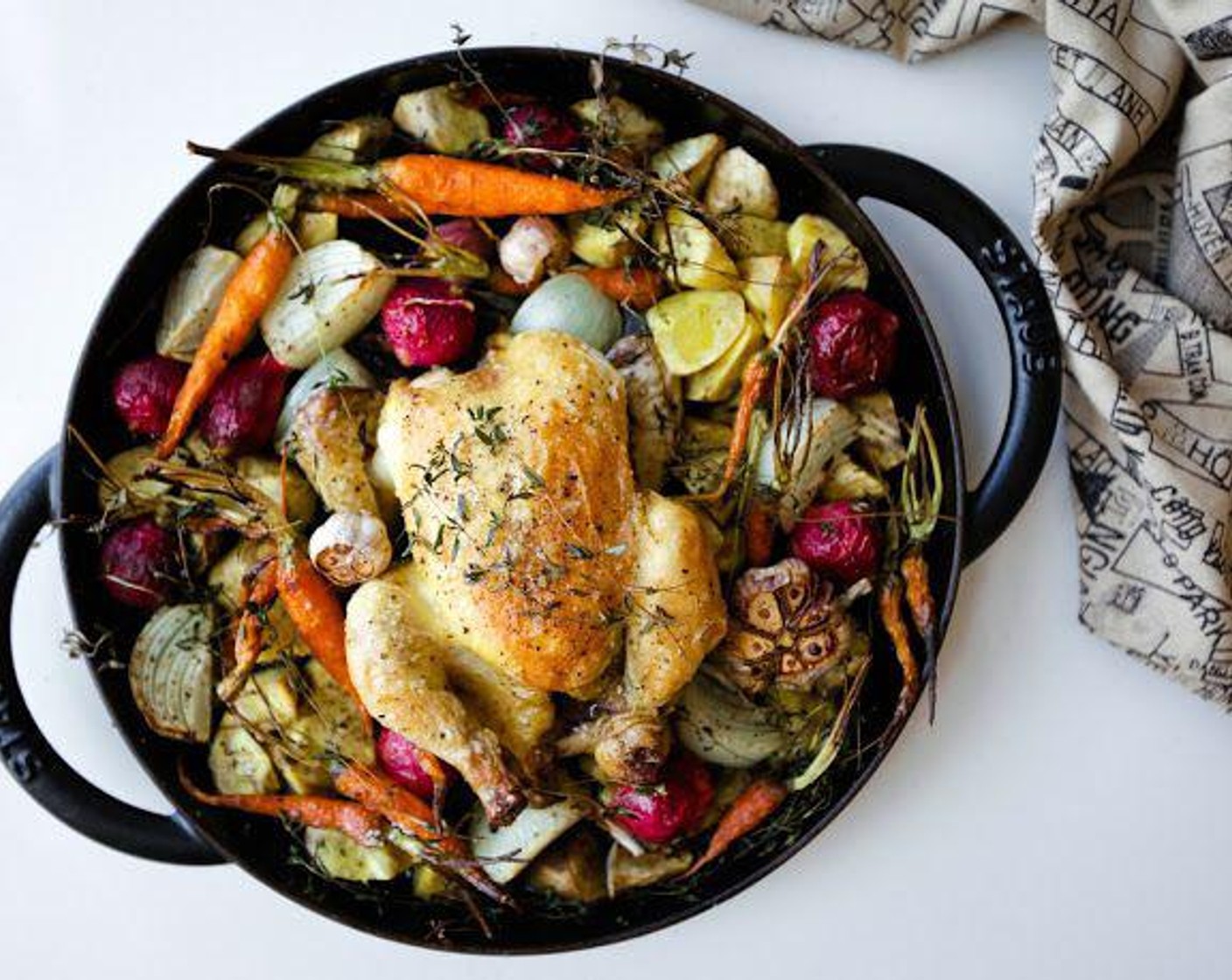 Wer liebt nicht ein köstliches, einfaches Gericht, bei dem alle Zutaten in einer einzigen Pfanne zubereitet werden und der Abwasch entfällt?! Unser derzeitiges Lieblingsgericht ist dieses Brathähnchen mit Süßkartoffeln, Babykarotten und Radieschen in einer Pfanne.
