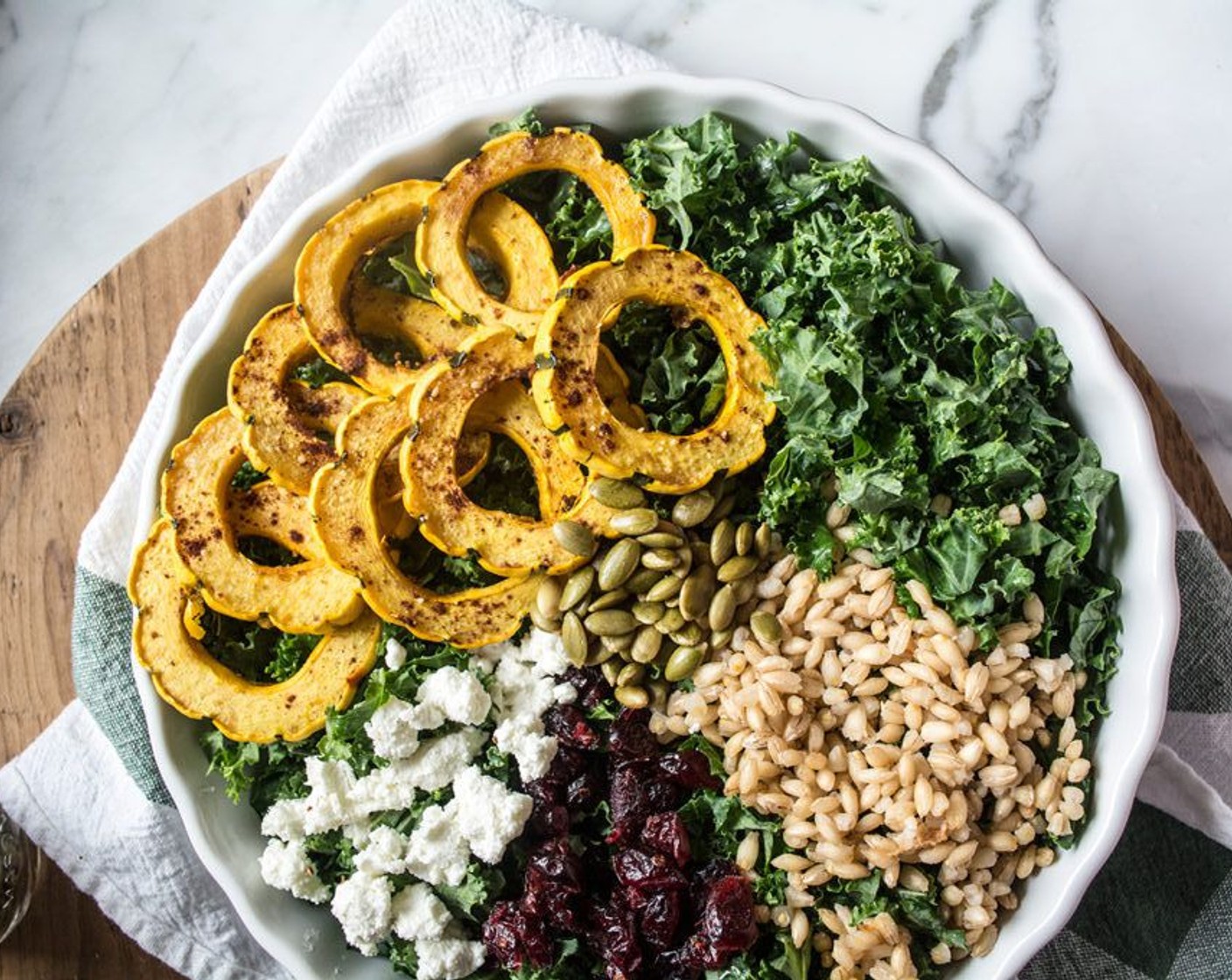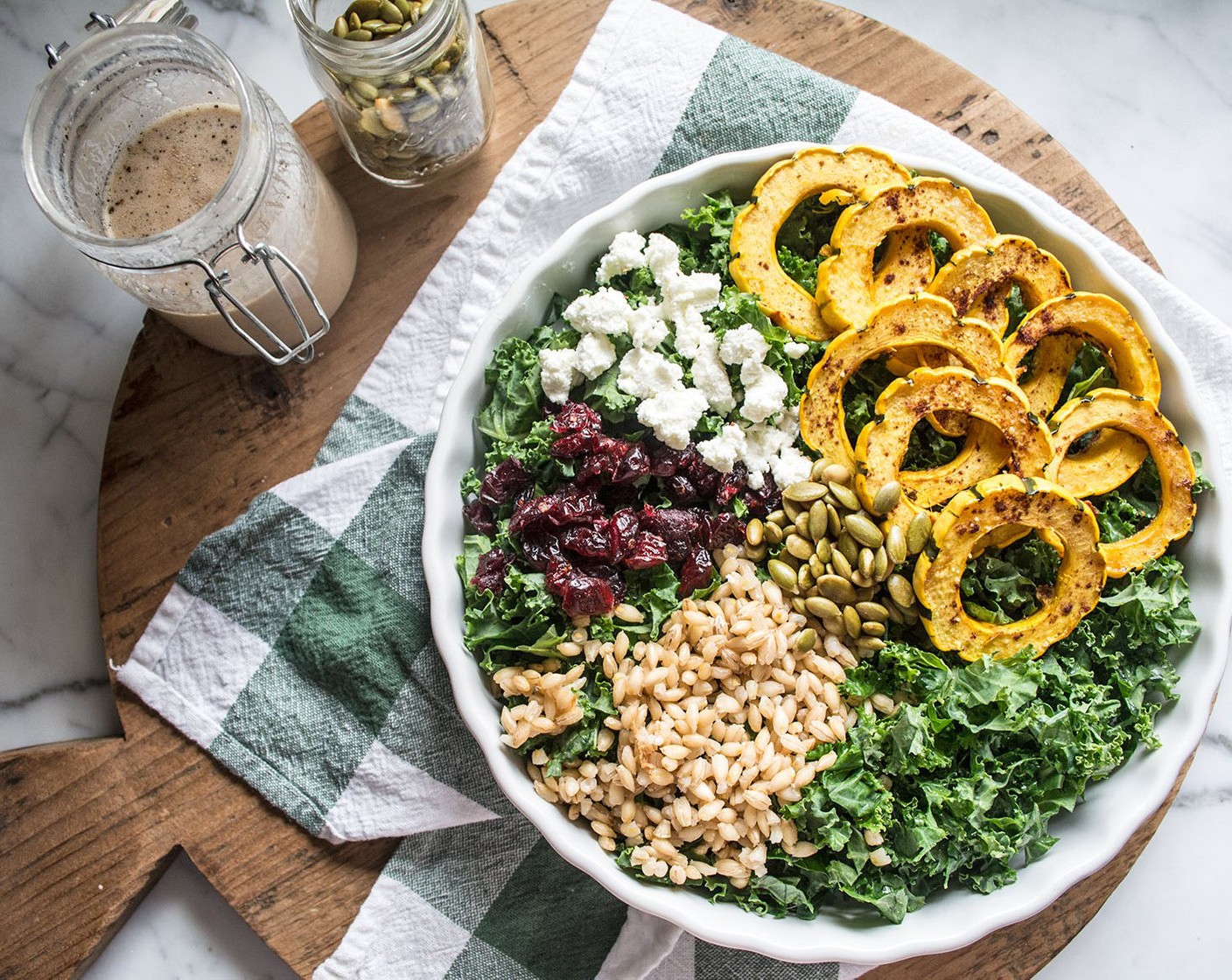 Die leichte süsse des Kürbisses wird durch den Zimt und dem Parmesankäse verstärkt und harmoniert wunderbar mit den getrockneten Cranberries und der hausgemachten cremigen Zitronen-Balsamico-Vinaigrette. Die Gerste sorgt für eine tolle Textur, während die Kürbiskerne einen schönen Knackpunkt darstellen, und was wäre ein "Special Salat" ohne ein wenig Ziegenkäse? Der Kale-Salat eignet sich hervorragend für ein herzhaftes Mittagessen, aber auch als Beilagensalat für eine Dinnerparty.