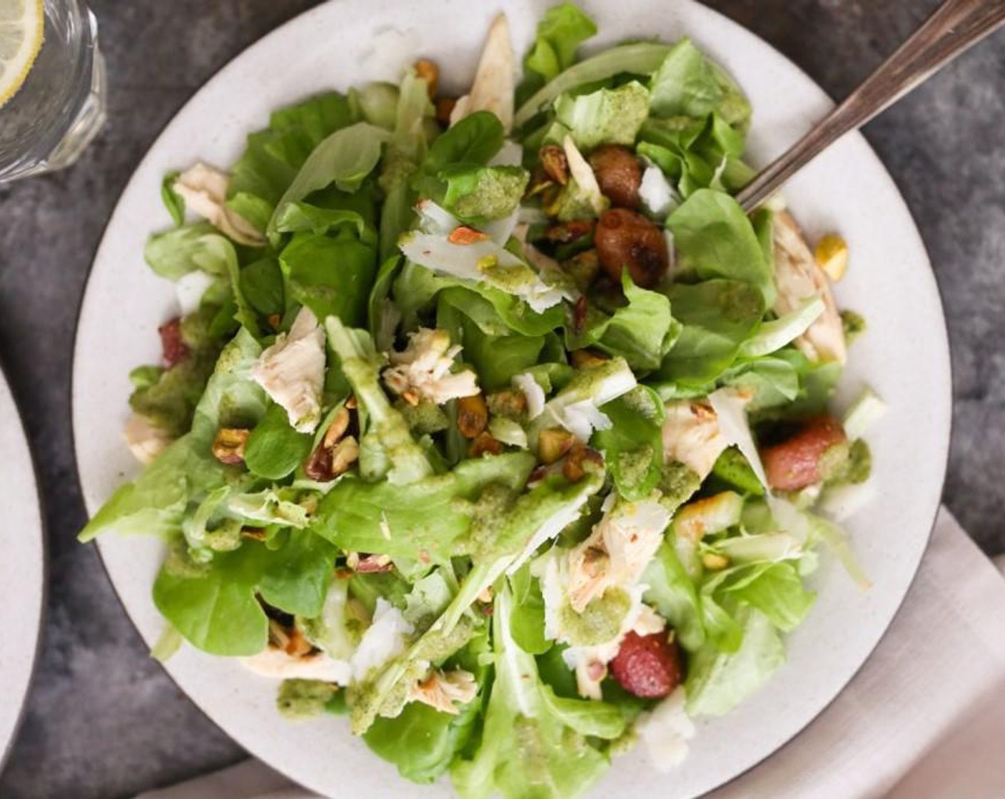 Dieser Salat vereint zartes Poulet, süss geröstete Trauben, knackige Pistazien und würzigen Manchego zu einer geschmackvollen Komposition. Das frische Basilikum-Dressing rundet die Aromen perfekt ab. Ein vielseitiger Salat, der sich nach Belieben anpassen lässt und sowohl als Hauptgericht als auch als Beilage eine hervorragende Wahl ist.