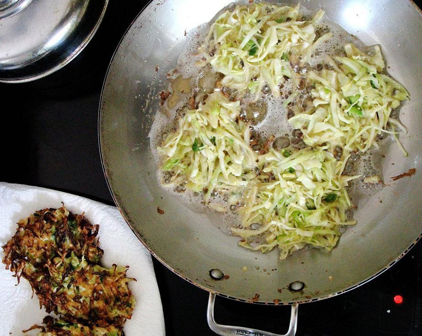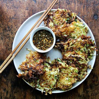 Okonomiyaki, japanische Kohlpfannkuchen, können auf unzählige Arten zubereitet werden; okonomiyaki bedeutet so viel wie "nach Belieben zubereitet". Diese Rösti sind einfach zuzubereiten und bieten eine köstliche Reste-Verwendung für verschiedene Kohlsorten.