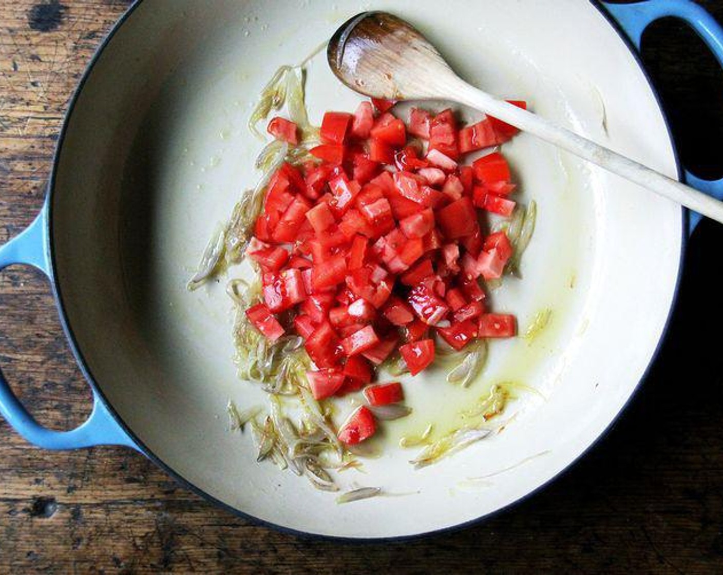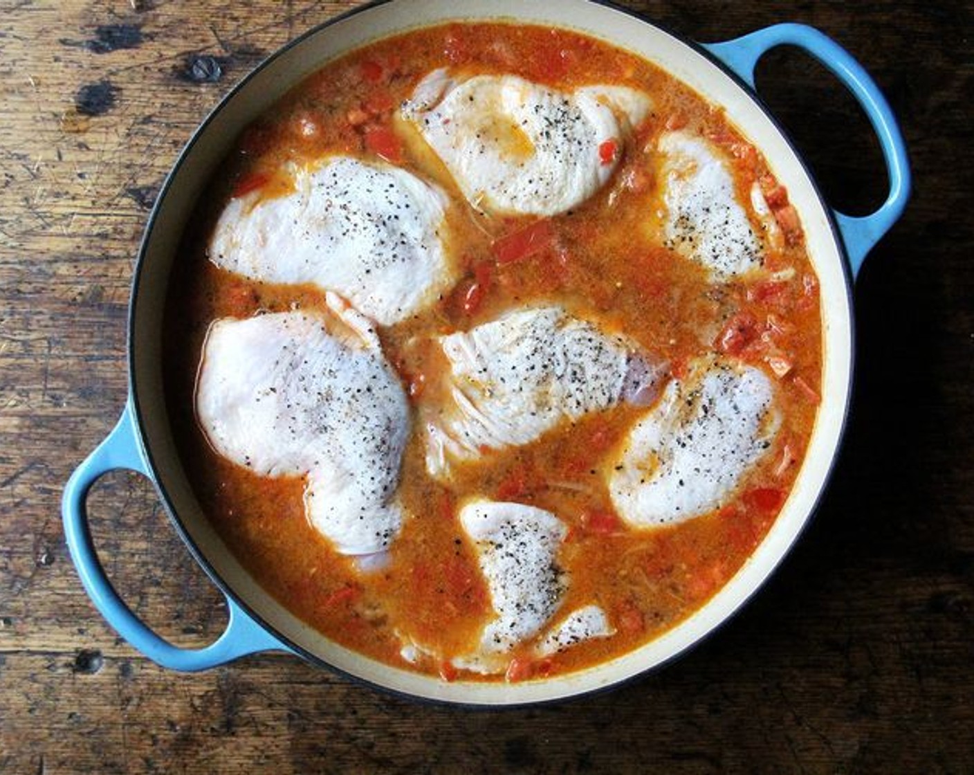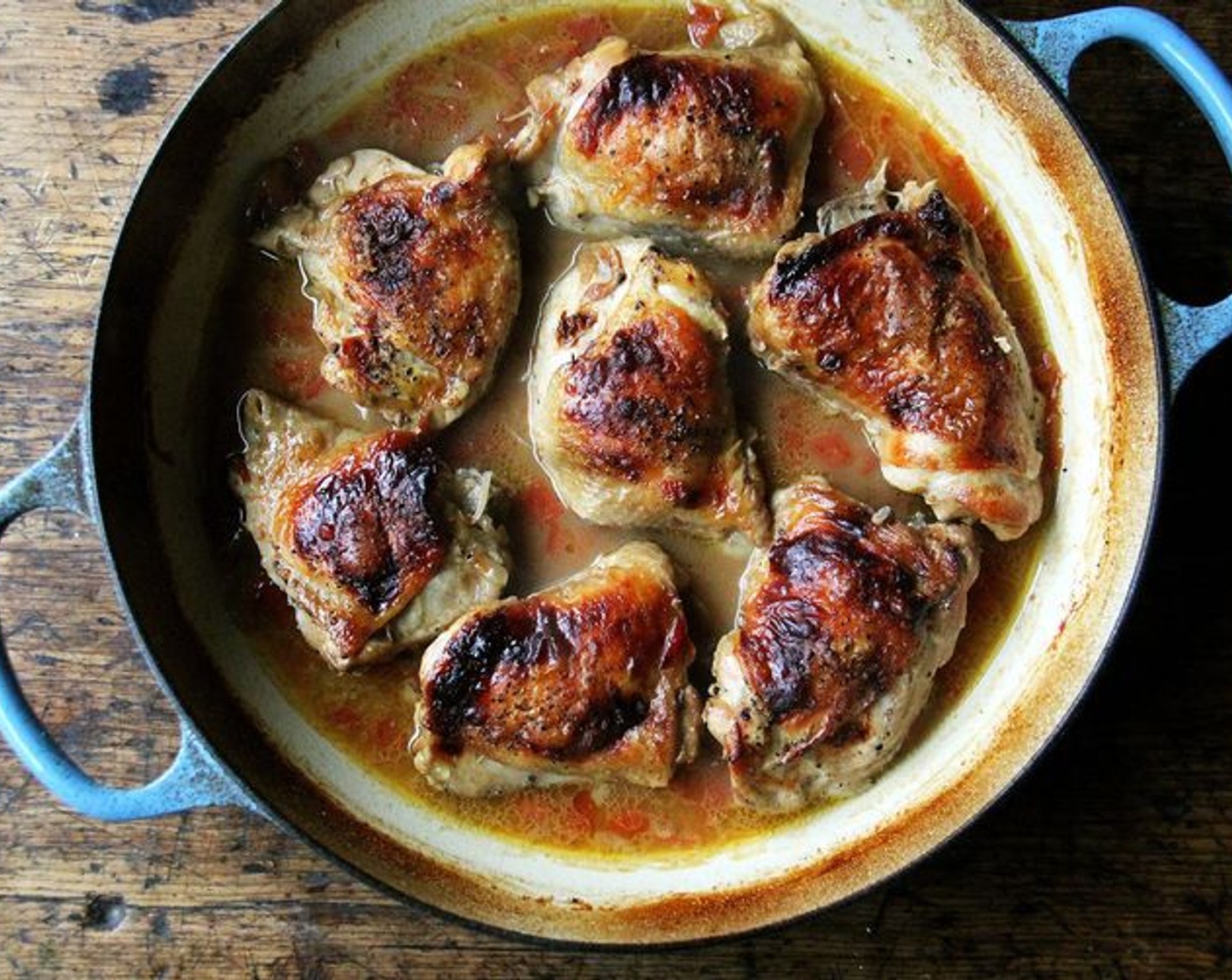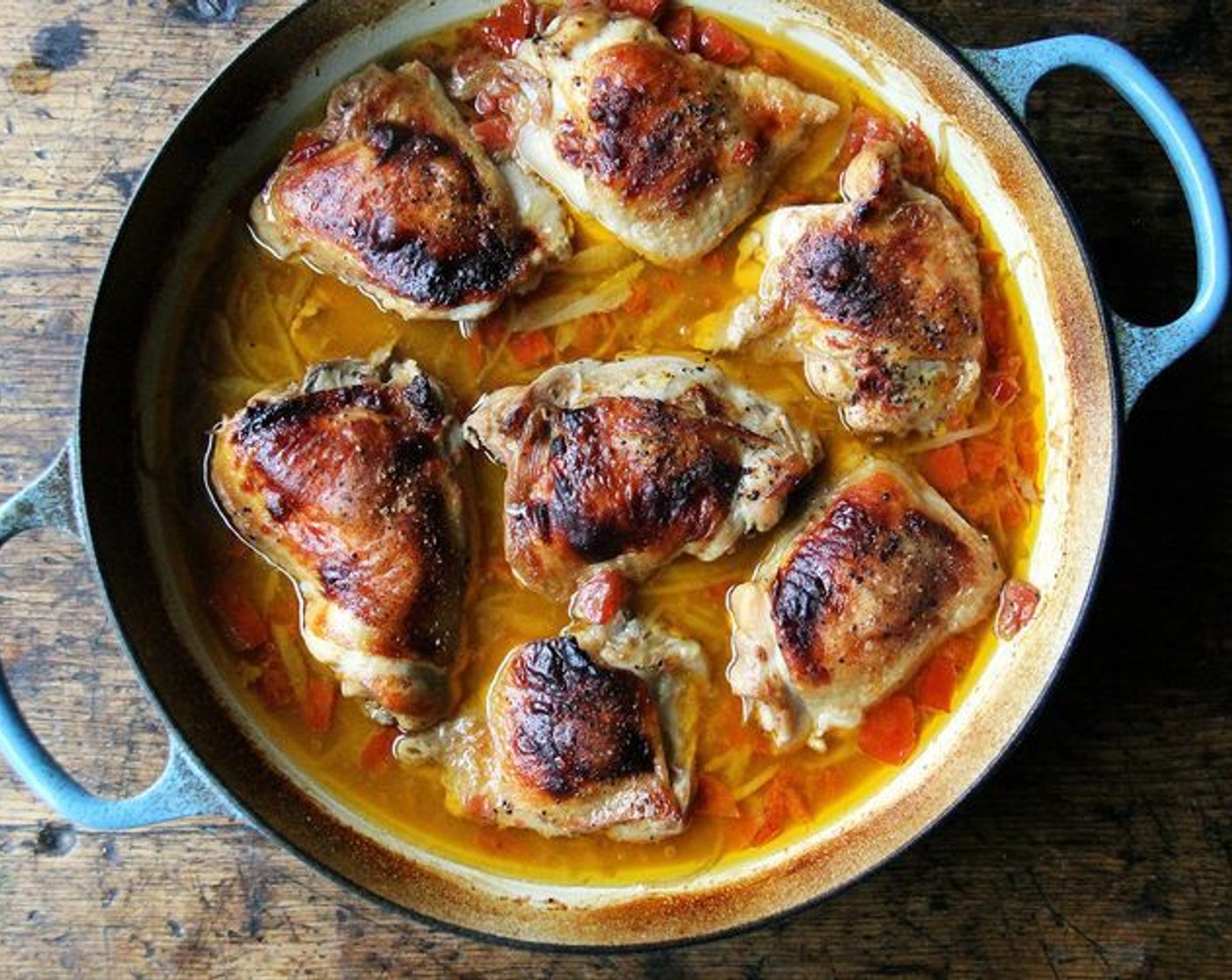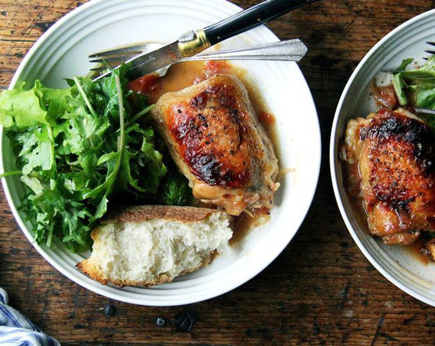 Das Hähnchen mit Sherry-Essig-Sauce aus der Pfanne hat eine wunderbar goldene und knusprige Haut, das Fleisch fällt vom Knochen und die Sauce schwappt nur so über. Und das Beste daran? Das Huhn muss nicht angebraten werden. Man bereitet es einfach der Sauce zu und schiebt es in den Ofen. Etwa 45 Minuten später ist das Abendessen fertig!