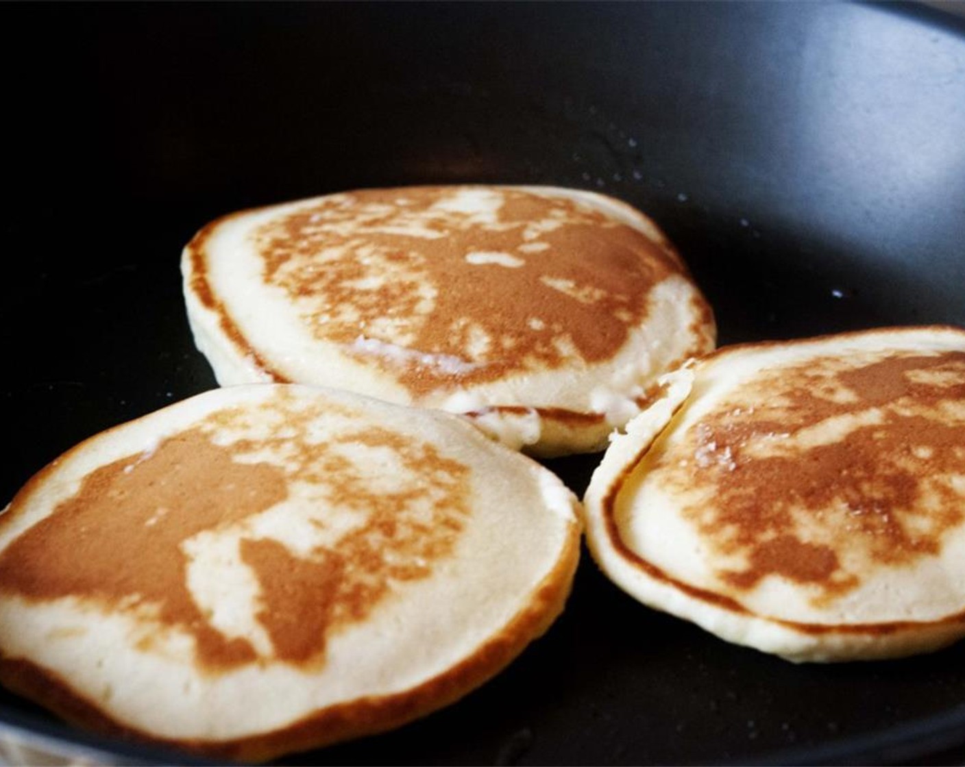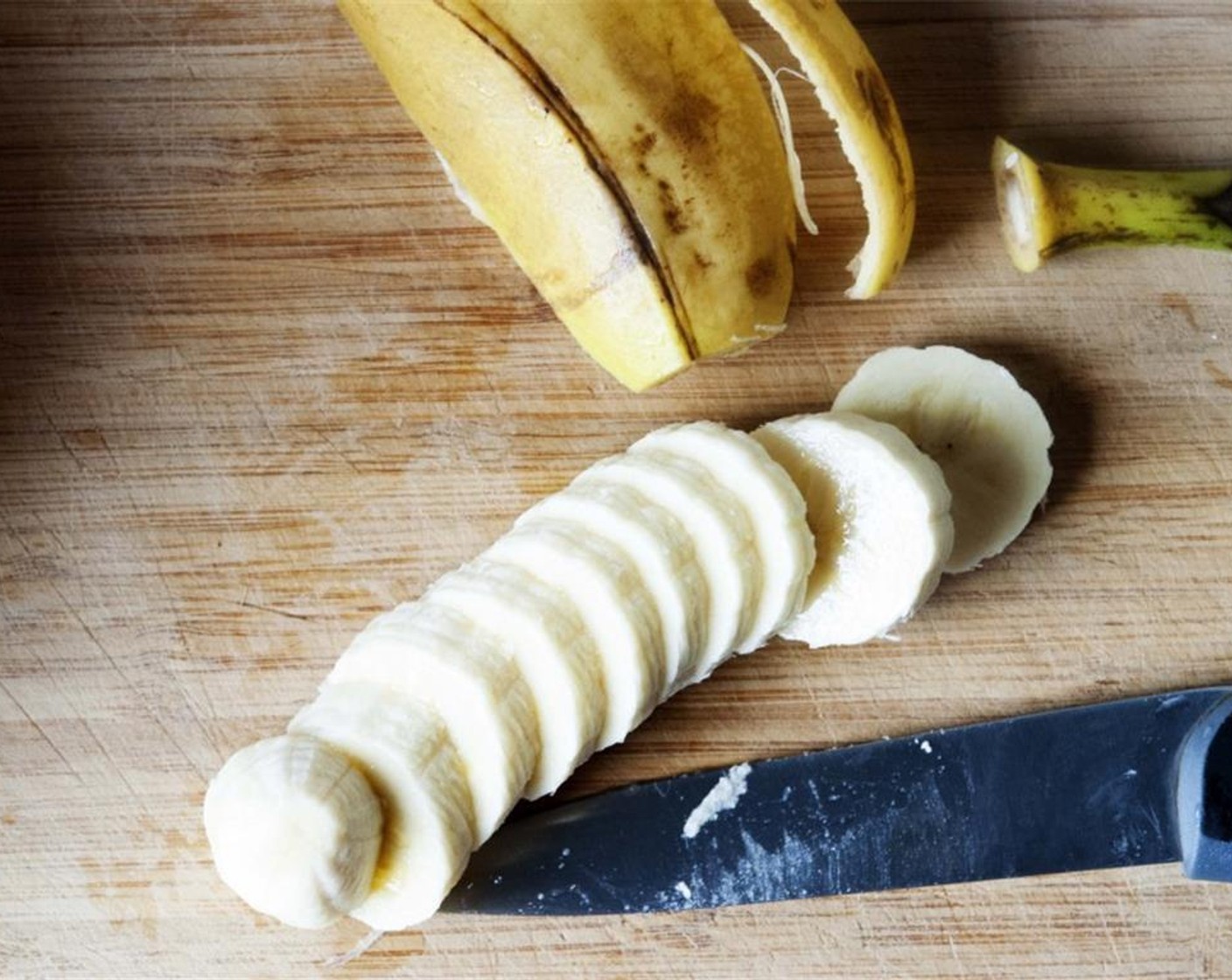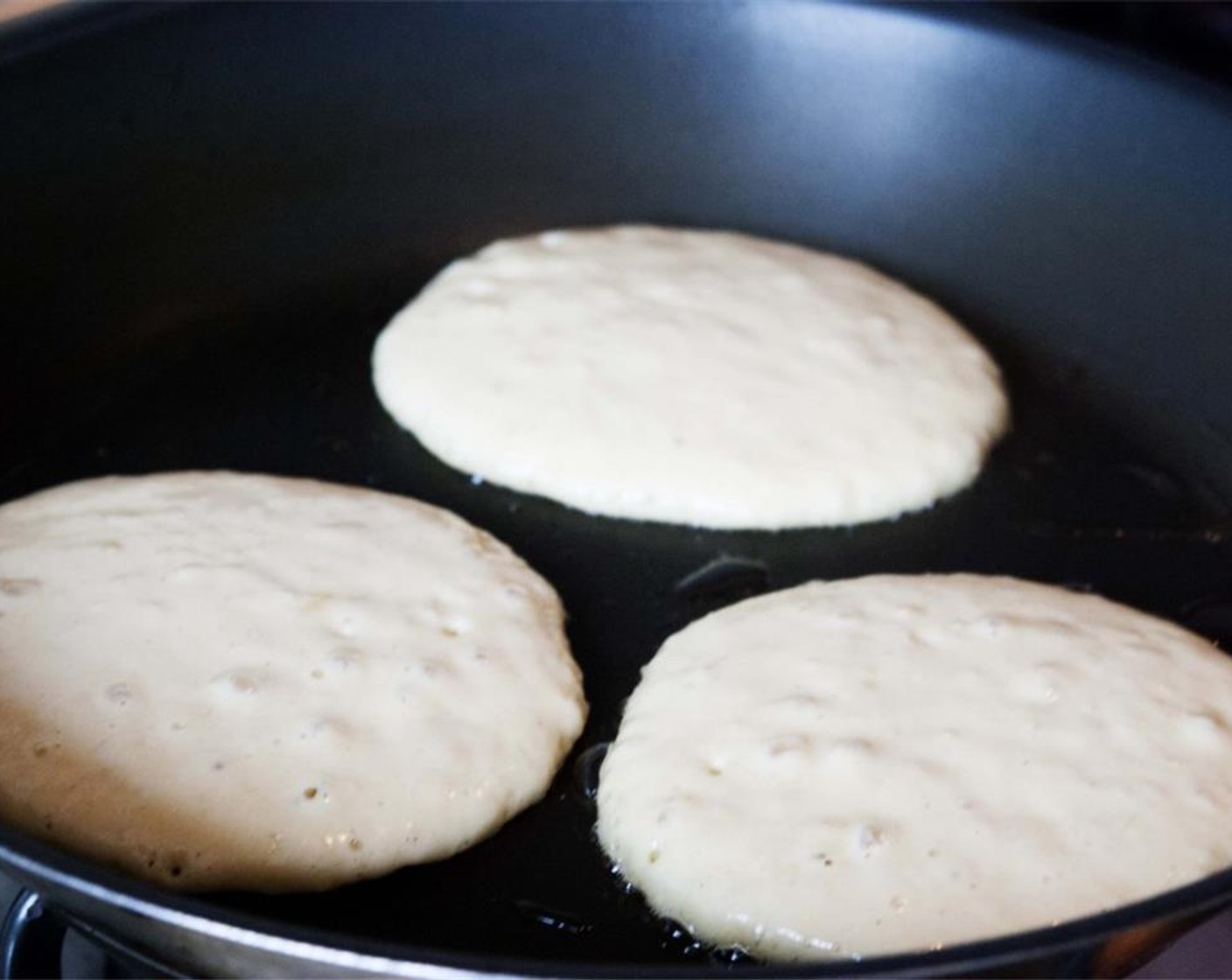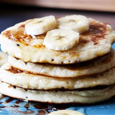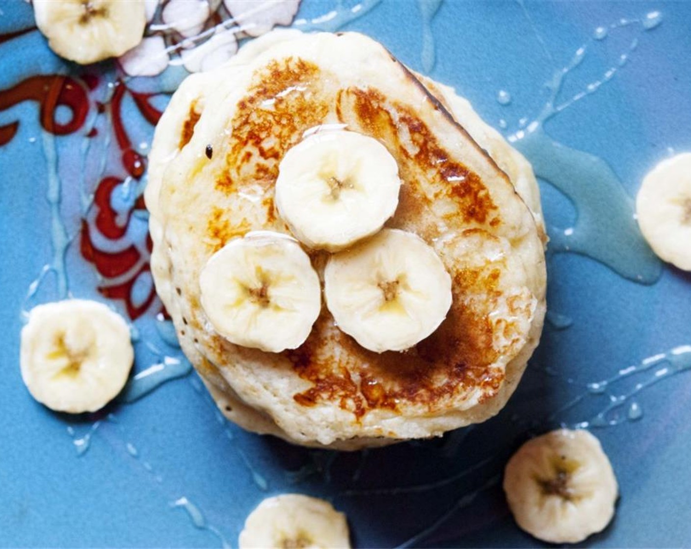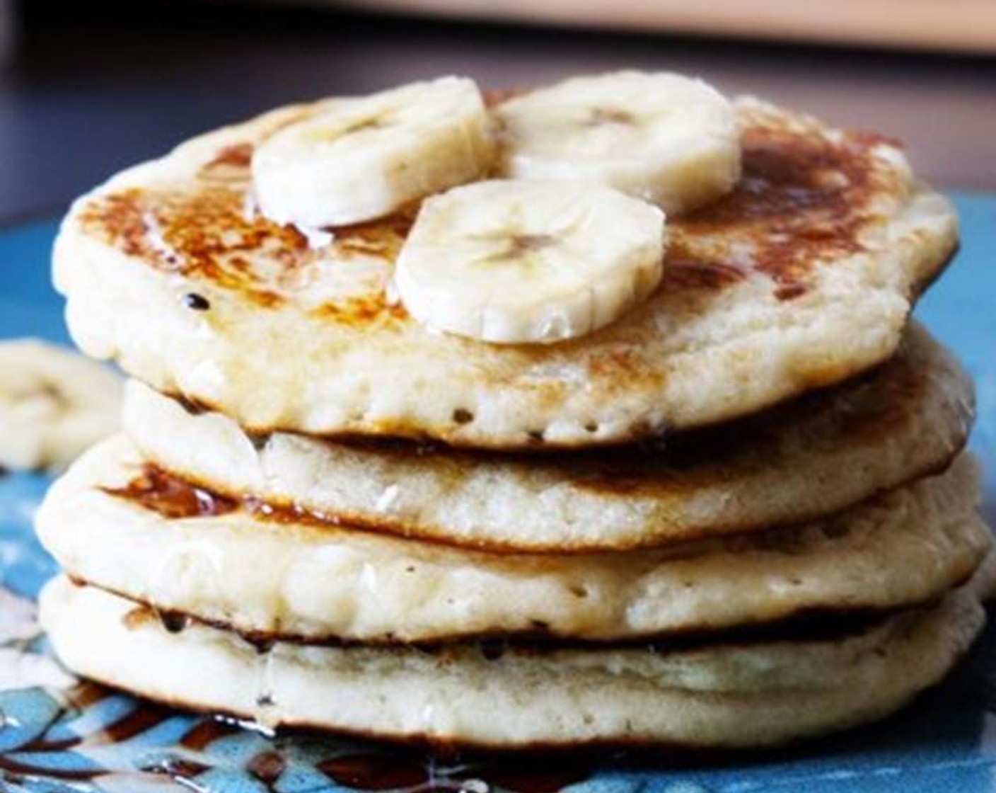 Leckere Bananenpfannkuchen schmecken am besten mit Ahornsirup und frischen Bananenscheiben als Topping.