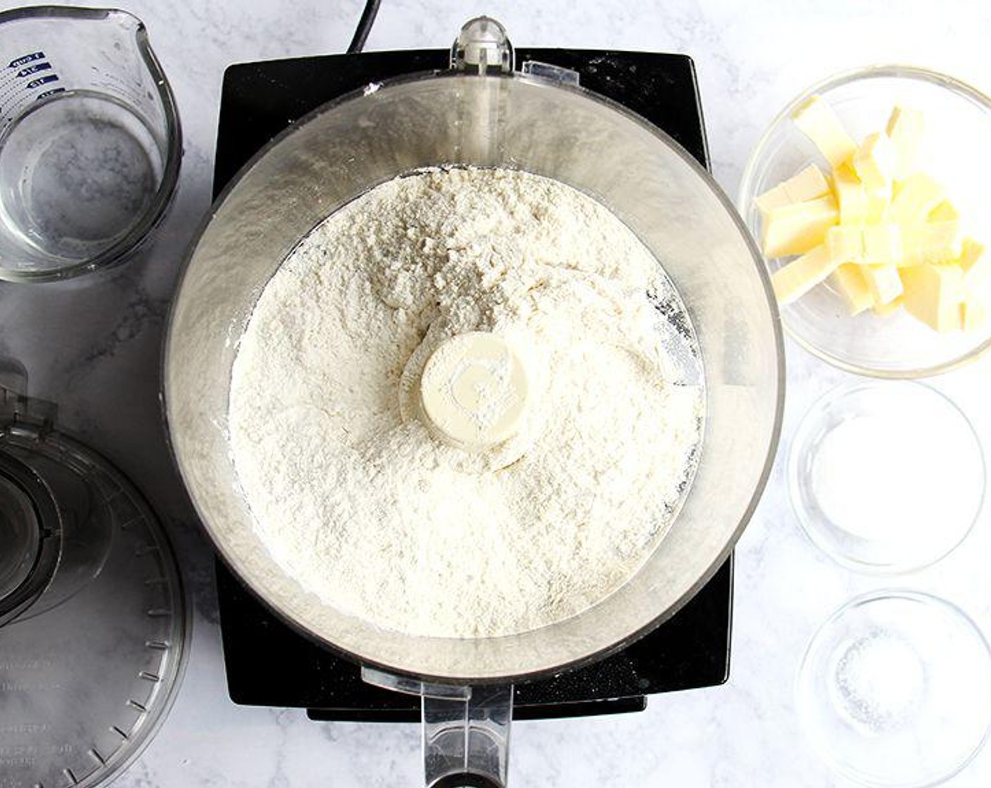 In der Schüssel einer Küchenmaschine Mehl (285 g), Zucker (2 Esslöffel), und Kosher Salz (1/2 TL) zusammen pulsieren. Die Butter, ungesalzen (225 g) in kleine Stücke schneiden und dann in die Küchenmaschine geben. In 1-Sekunden-Intervallen pulsieren, bis die Butter die Größe von Erbsen hat. Fügen Sie das Wasser (120 ml) hinzu und pulsieren Sie erneut etwa 10 Mal, bis die Mischung krümelig ist, aber zusammenhält, wenn Sie sie zusammendrücken.