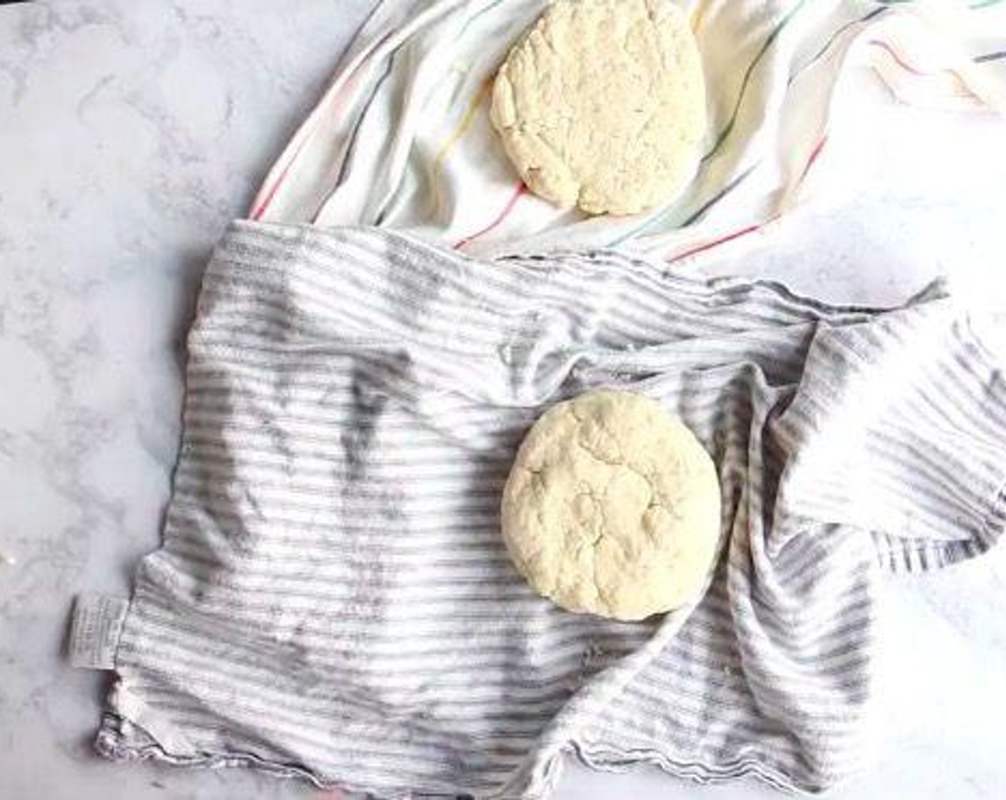 Legen Sie zwei saubere Geschirrtücher auf eine Arbeitsfläche. Geben Sie die Hälfte der krümeligen Teigmischung in die Mitte von jedem. Fassen Sie die vier Ecken des Handtuchs zusammen und drehen Sie es, um eine Bettlertasche zu schaffen, indem Sie den Teig in eine Scheibe drücken. Wickeln Sie das Handtuch aus und verwenden Sie Ihre Hände, um die Scheibe zu packen und zusammenzuklopfen. Wickeln Sie die Runden in Plastikfolie, stecken Sie sie in einen Druckverschlussbeutel und lagern Sie sie 3 Tage im Kühlschrank oder 3 Monate im Gefrierschrank.