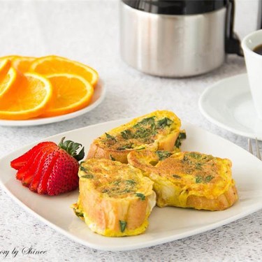 Schritt 4 Spinat unter die Eier heben. Die Baguettescheiben in der Ei-Mischung einweichen und mit einer Gabel hier und da einstechen. Dadurch wird das Brot wirklich mit der Ei-Mischung durchtränkt und die Mitte wird weicher. Den Spinat gleichmäßig auf dem Brot verteilen.