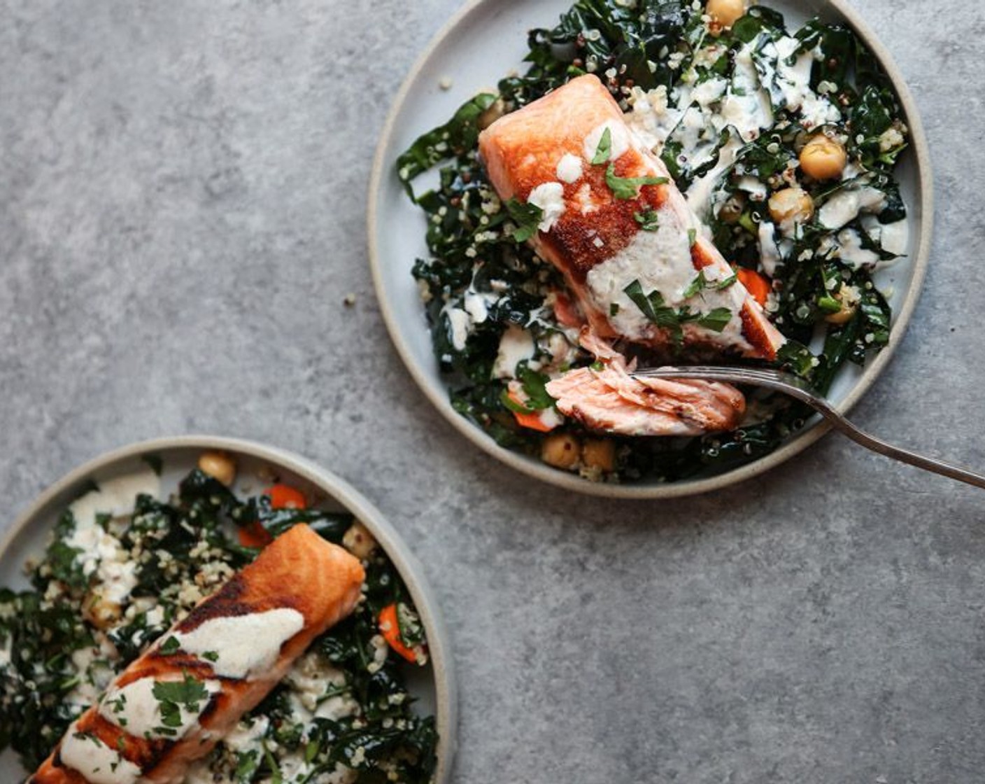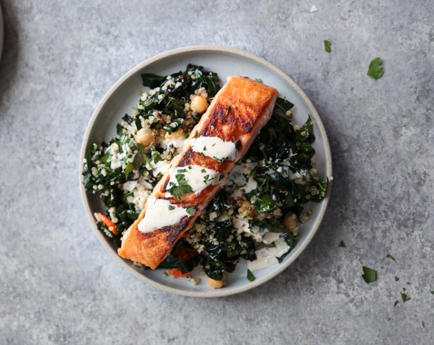 Wenn du ein schnelles, gesundes Abendessen für die Woche suchst, sind diese Lachs- und Quinoa-Bowls genau das Richtige. Herzgesunder Lachs, Blattgemüse, Vollkornprodukte, Hülsenfrüchte, probiotikareicher Joghurt, cremiges Tahini: das ist gesunder Hedonismus in einer Schüssel, in weniger als 30 Minuten.
