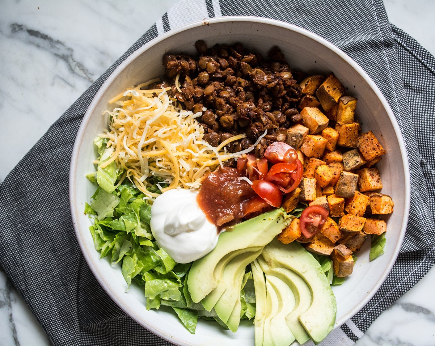 One-Bowl-Gerichten sind vielseitig, sie enthalten in der Regel viele Nährstoffe und sind farbenfroh. Das heisst, sie sind optisch ansprechend und versorgen den Körper mit gesunden Lebensmitteln. Diese einfache Linsen-Süsskartoffel-Taco-Bowl ist nicht nur kinderleicht, sondern auch in 30 Minuten zubereitet. Die gewürzten Süsskartoffeln und Linsen sind deftig, warm und sättigend, während der frische Römersalat, die Avocado und die Tomaten eher die leichte Seite ansprechen und die perfekte Balance schaffen.