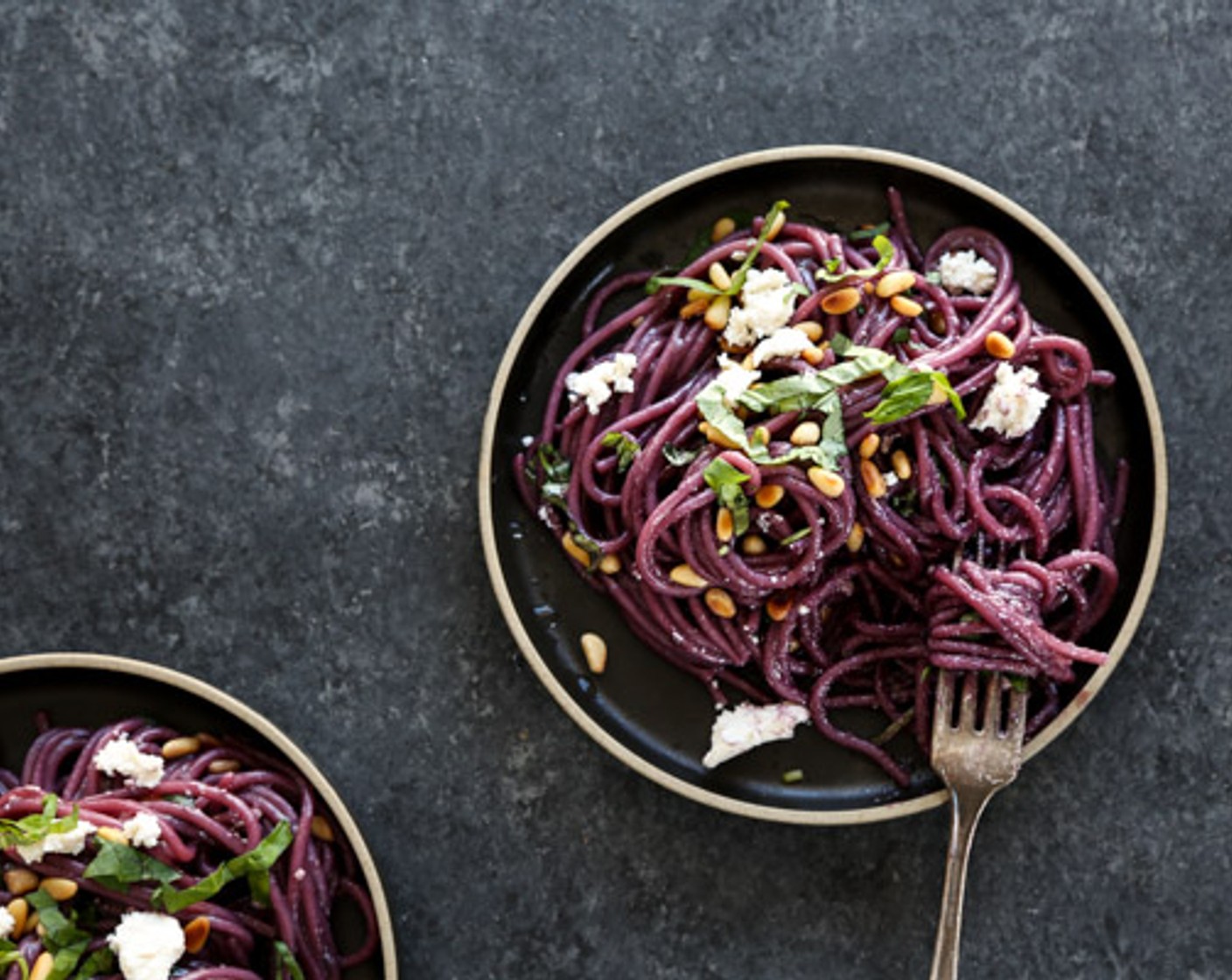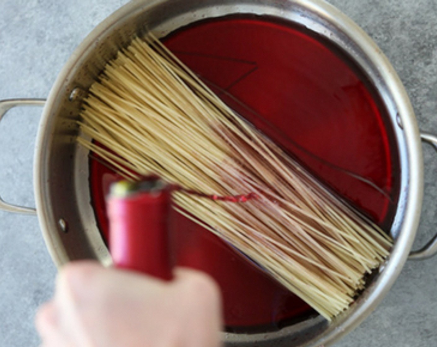 Die Technik für dieses Rotwein-Spaghetti-Gericht ist eine Kreuzung aus Pasta und Risotto. Die Nudeln saugen sich beim Kochen mit dem Wein voll und bekommen so eine tiefrote Farbe.