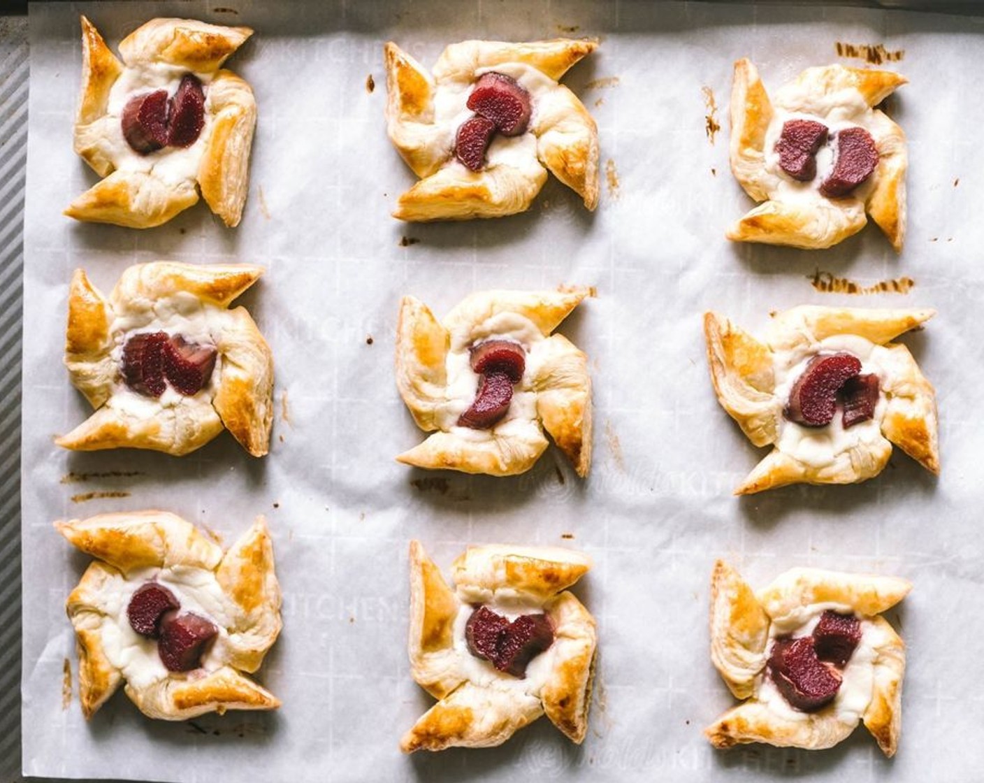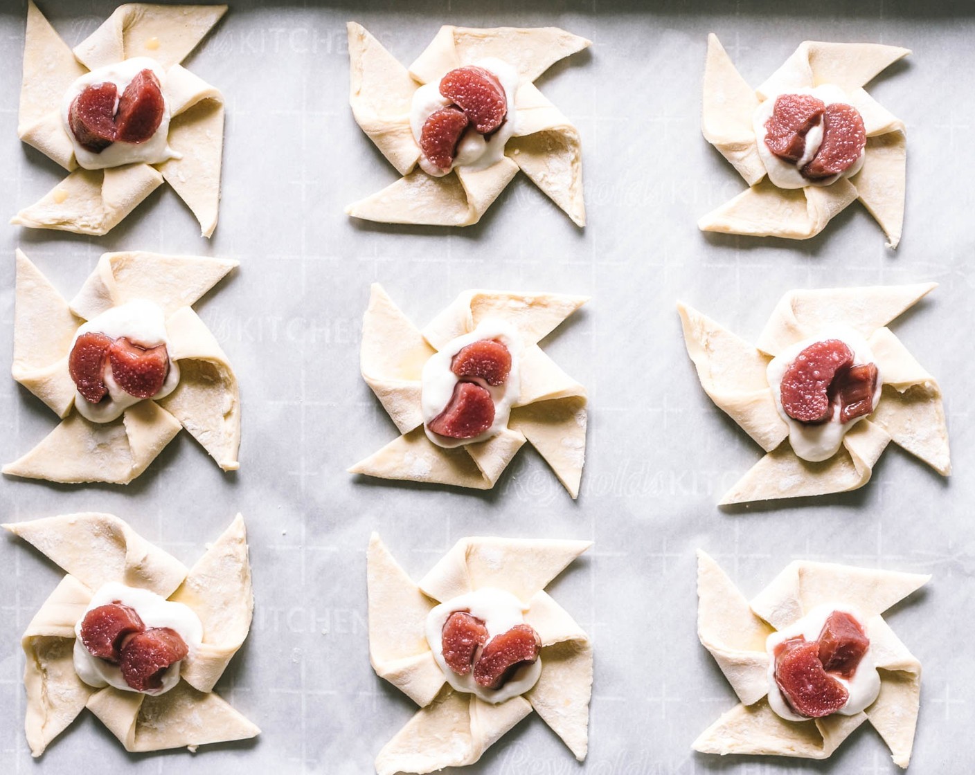 Erdbeer-Rhabarber-Ricotta-Käse Küchlein oder auch "Dänische Plunder". Sie sind nicht nur einfach sondern haben eine leichte süsse, so dass man sie genauso gut zum Frühstück verzehren kann.