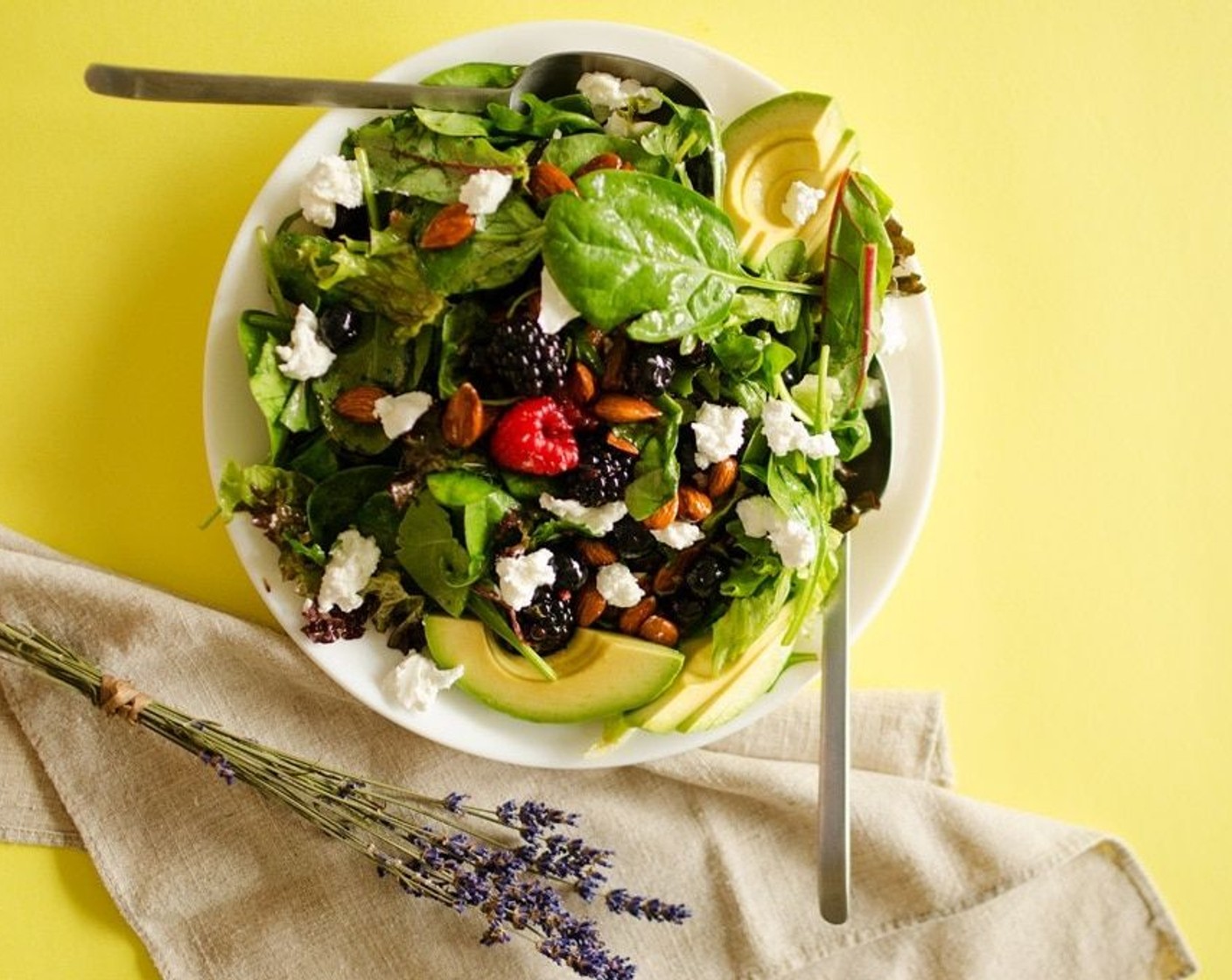 Ein erfrischender Sommersalat mit frischen Beeren und Ziegenkäse, beträufelt mit einer Zitronen-Vinaigrette und Lavendel!