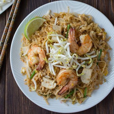 Authentisches Pad Thai leicht gemacht! Reisnudeln, gebraten in einer süss-würzigen Sauce, kombiniert mit Garnelen, Tofu, gerösteten Erdnüssen und frischen Sojasprossen. Herrlich!