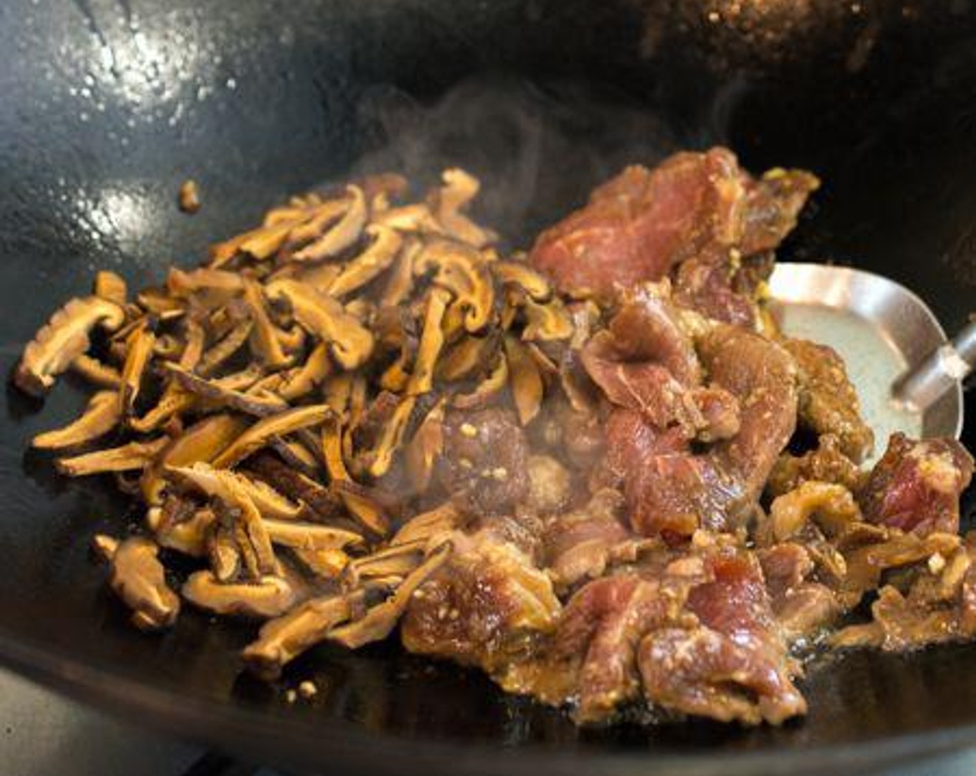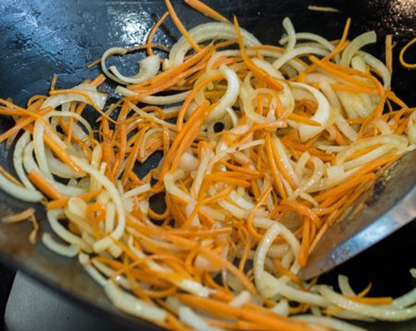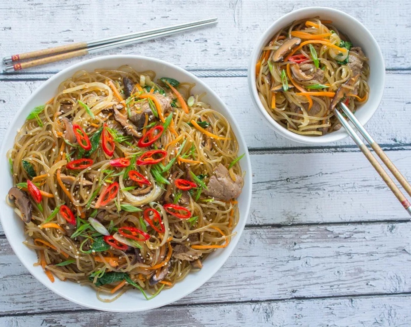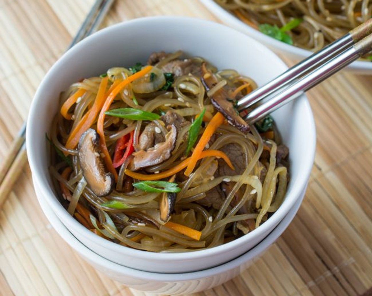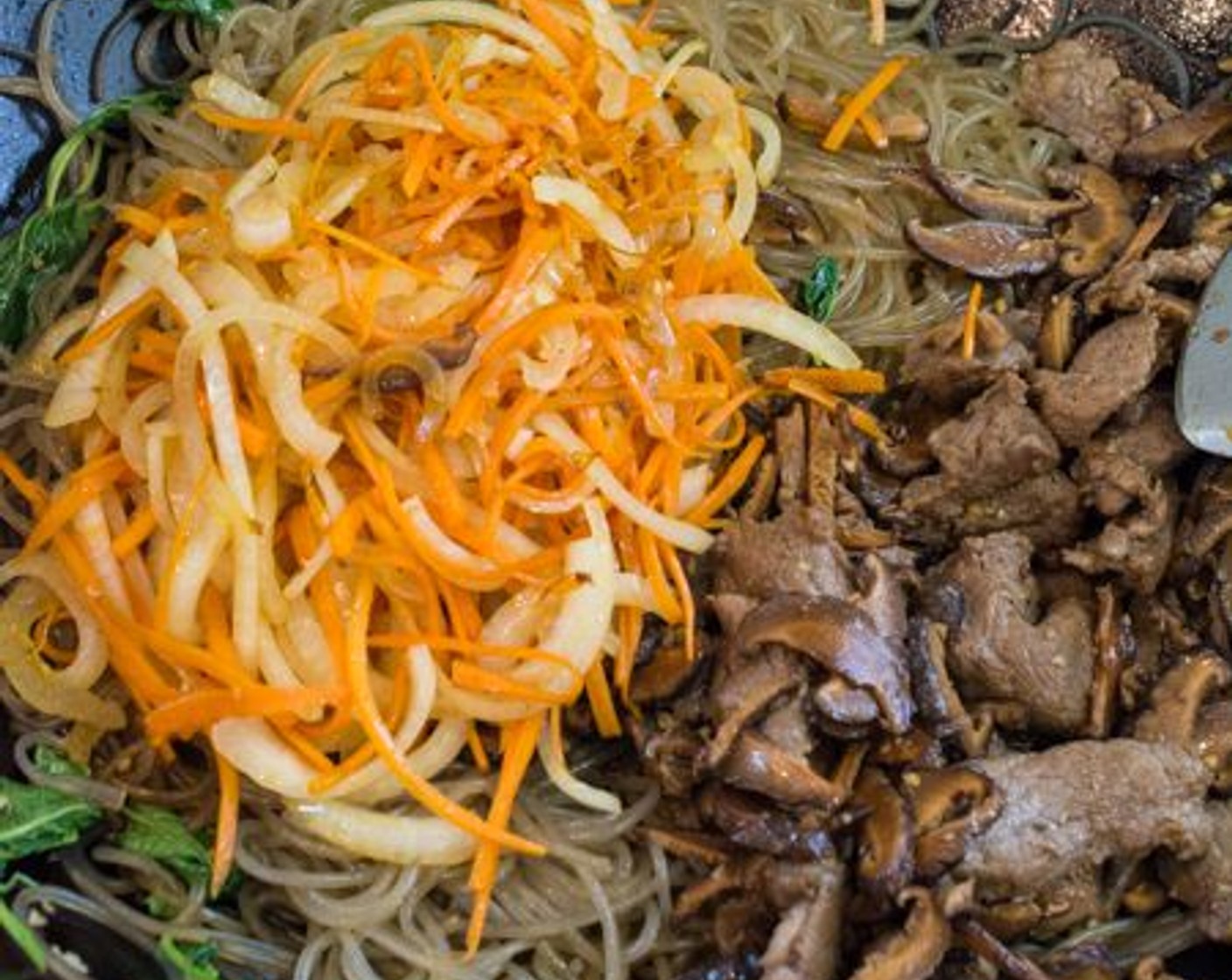 Japchae (ausgesprochen "chaap-chay") ist ein klassisches und beliebtes koreanisches Nudelgericht, das typischerweise zu besonderen Anlässen und auf Partys serviert wird. Es kann sowohl als Beilage, Hauptgericht oder auch über Reis serviert werden. Gebratene Glasnudeln mit in Scheiben geschnittenem Rindfleisch, Karotten, Gemüse und Pilzen in einem süssen und herzhaften Sojasaucen-Dressing.