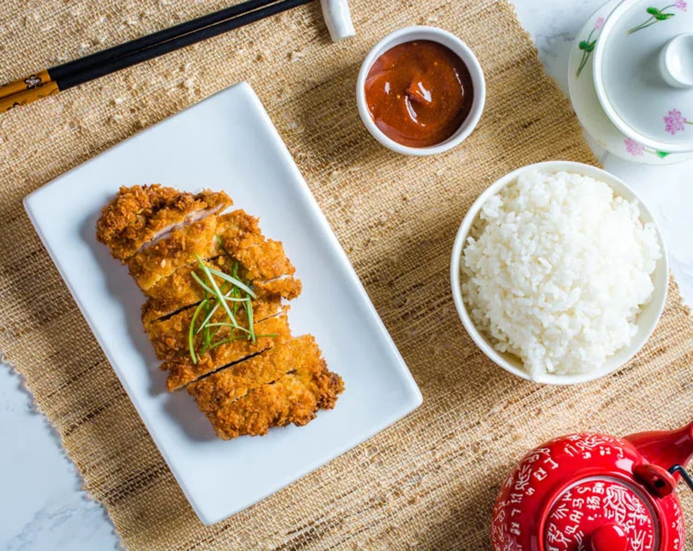 Chicken Katsu ist eine Abwandlung des klassischen japanischen Tonkatsu (panierte, frittierte Schweineschnitzel), aber mit Hühnerfleisch anstelle von Schweinefleisch zubereitet. Es wird mit Tonkatsu-Soße und natürlich mit gedämpftem Reis serviert.